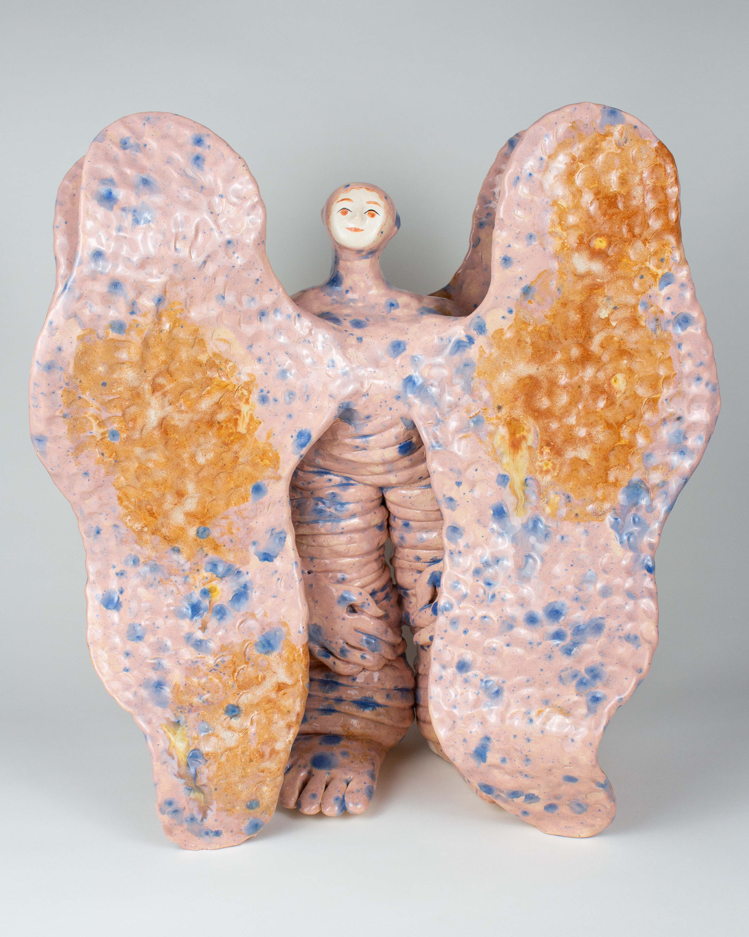 Der poetische Ausstellungstitel bringt zwei vermeintlich gegensätzliche Elemente in Dialog: Erde steht für Substanz und Beständigkeit, für Ursprung und Nährboden. Flügel dagegen verkörpern Leichtigkeit und Aufbruch, stehen für Träume und Alternativen. Diese Verbindung wird in den Keramiken konkret erfahrbar – etwa wenn eine Figur in standfester Kontrapost-Haltung mit massigem Fußbereich am Boden verankert ist, während Flügel, Farbigkeit und Auftreten nach außen streben.